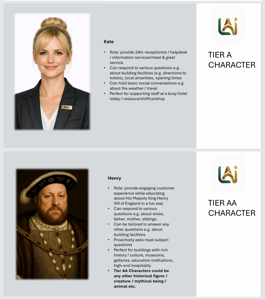 We are transforming customer services, experiences, and engagement, through provision of tailor-made lifelike AI that behaves and looks like a living being. Below are some examples of characters we have brought to life.